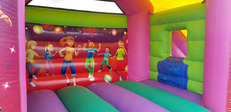 This castle is made up of heaps of gorgeous colours! With a gorgeous blue slide, blue ad purple bounce bed, and bright yellow shower cover, it will be the pop of life you need to add energy to your special day! The stunning digitally artworks depicts fellow disco goers, dancing the night away on this amazing bounce and slide! The side slide means there is also plenty room for a bounce area inside the castle, leaving plenty of room for the children to all have a bounce! To ensure your loved ones have a safe and fun day, all open areas of the bounce and slide will be surrounded by safety mats, leaving the adults to just focus on having a great day!