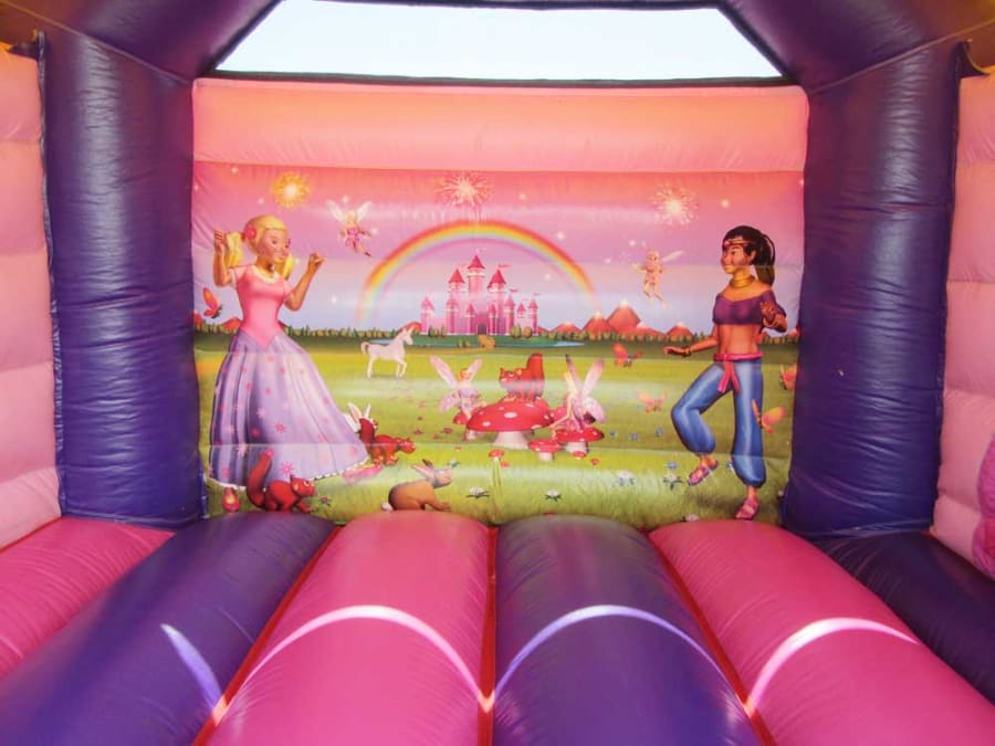 With the base colours of this stunning castle being gorgeous shades of pink and purple,, you will have just the princess feel you are wanting to create. On the front frame there are two beautiful princesses waiting to greet all your little royals! Travelling inside the castle there is a pretty back drop of more princesses along with this animal friends and a lovely rainbow. On the side of the castle is where you will find the amazing slide! This means there is plenty of room to bounce around while other children are having a go on the slide. The sewn in shower cover also means you won’t have to stress about the outdoor weather. We also provide safety mats at all open areas of the bounce and slide, helping to ensure safe fun throughout the event!