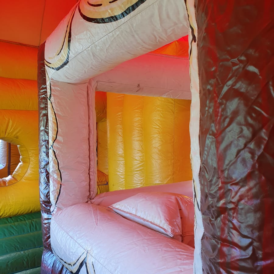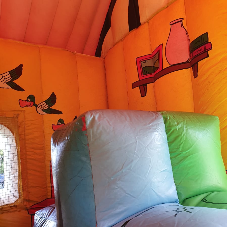 The first thing you will notice is the sheer size of this stunning inflatable crazy cottage. It is full of exciting and unique features, which will keep all the children busy and playing all day. With two bouncing areas, there is room for everyone to bounce safely and enjoy more time on the inflatable. Face bish bash as you travel throughout the cottage, knock them down, jump on them, weave through them! The options are endless and are a real treat to the kids imagination! Climb the walls to reach the two amazing slides! Adventures into all the unique play areas, each themed to suit a room of the crazy cottage! All the brilliant graphic artwork helps to set the scene of the crazy cottage and makes this inflatable an apple to anyone’s eye. To help ensure safe fun, we do provide safety mats at all open areas of the fun run, so you don’t have to worry!