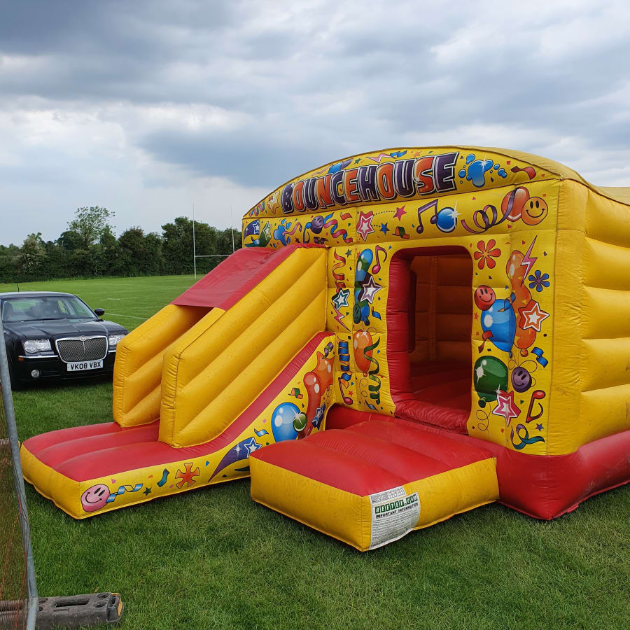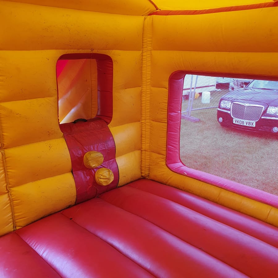 This stunning castle has two base colours which are bright yellow and red, making it a great eye catcher for any event. The outside frame is decorated with a gorgeous array of party themed artworks, such as beautiful balloons, streamers and music notes. The slide is on the front to the side, next to the entrance which allows for an easy system to avoid chaos on your special day. There are also observation areas, meaning the adults can keep an eye on all the fun their littles ones are having! We can also ensure there will be safety mats around all open sides of this bounce and slide, making it safe and accessible to all your little loved ones