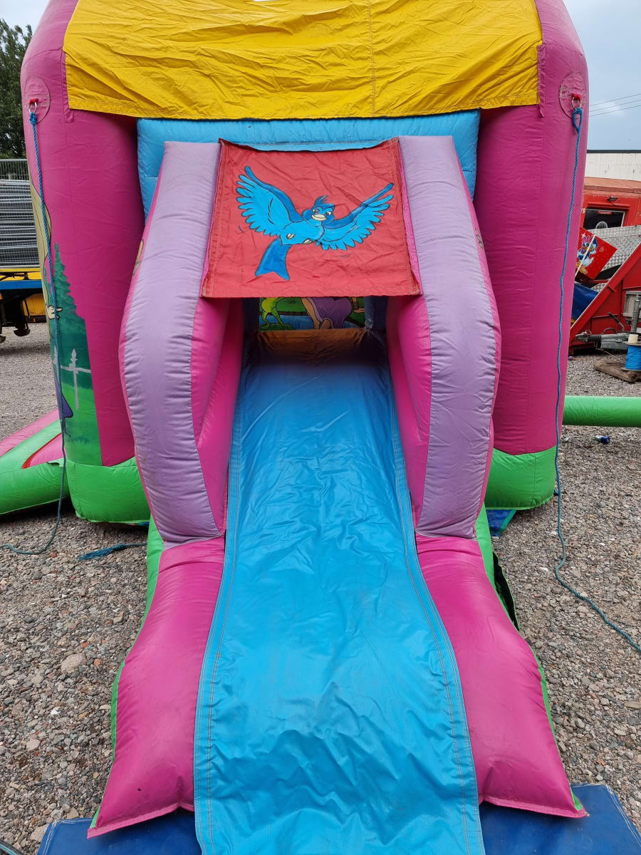 This beautiful bounce and slide has a gorgeous colour scheme of pink and green, bringing together the wonderful forest vibe to match the magical princess vibe. On the front frame you will see two stunning princesses ready to welcome you and all your guests into this amazing castle. On the backdrop you will see brilliant graphic artwork of another princess with her deer and rabbit, relaxing in the beautiful forest. There is a fun frog ready to watch you bounce the day away and a lovely blue bird to add another pop of colour to your event. The main event of course is the exciting slide that is located at the side of the castle and will be sure to bring smiles and laughter to your day. We also provide safety mats at all open areas of the bounce and slide, helping to ensure safe fun throughout the event!