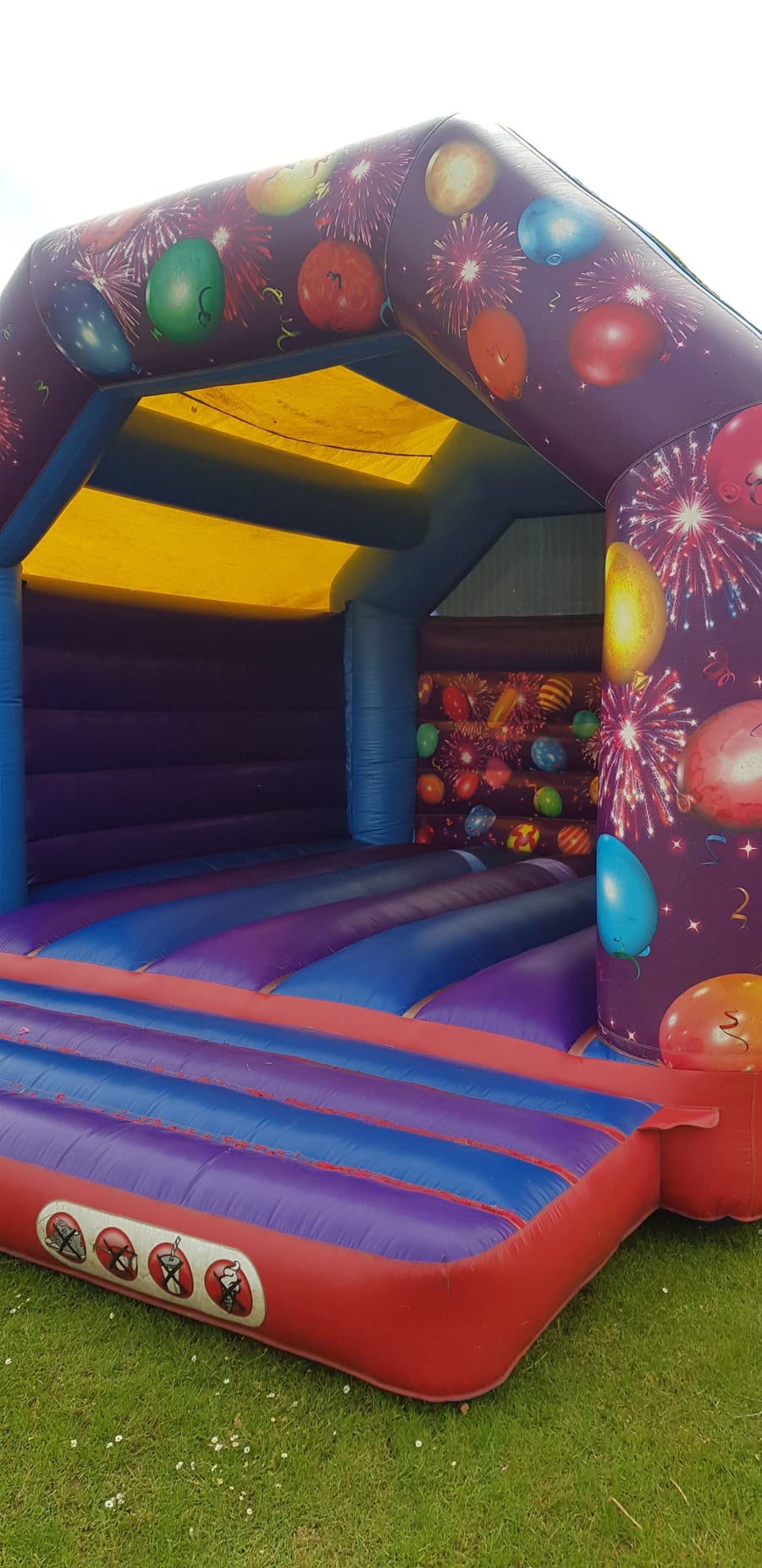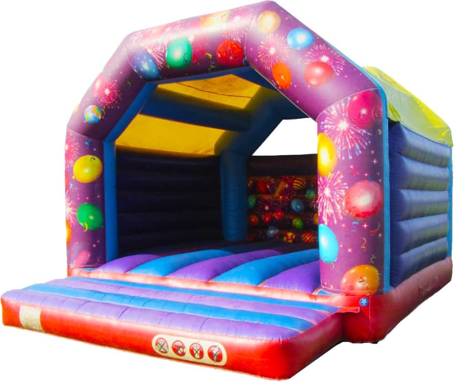 The bright and bold colours mean this castle will be the perfect eye-catching feature you want at your event| Predominantly purple and blue, it is a brilliant gender-neutral option, making it ideal for all special days! The stunning celebration themed painted artwork really helps to bring about that celebration atmosphere you are wanting to create! Covered in balloons and fireworks, it’ll be an explosion of fun for all the family, keeping you and your loved ones happy and bouncing all day!