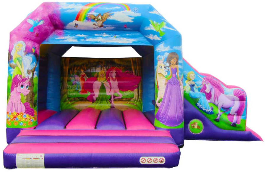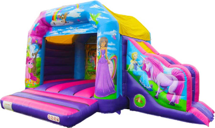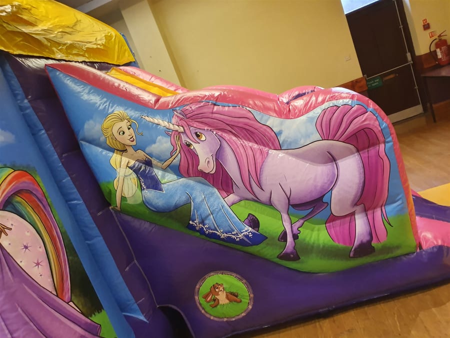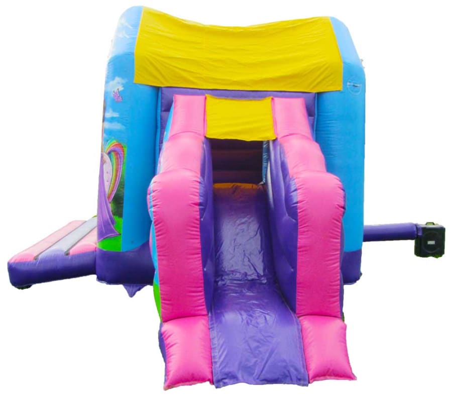 This castle in a whole pool of fun and fresh colours, ranging from purple to pink and even blue! Its lively and joyful appearance will make it a great feature for any event! The slide is located on the side of the castle, decorated with a fabulous unicorn companion, bringing so much fun to your day! The front from is also home to beautiful princesses and their unicorn friends, ready to greet everyone! The sewn in shower cover means that that this castle is ideal for most forms of weather, keeping you dry and out of the sun when needed! This means even the typically British weather cant rain on your parade! We also provide safety mats at all open areas of the bounce and slide, helping to ensure safe fun throughout the event!