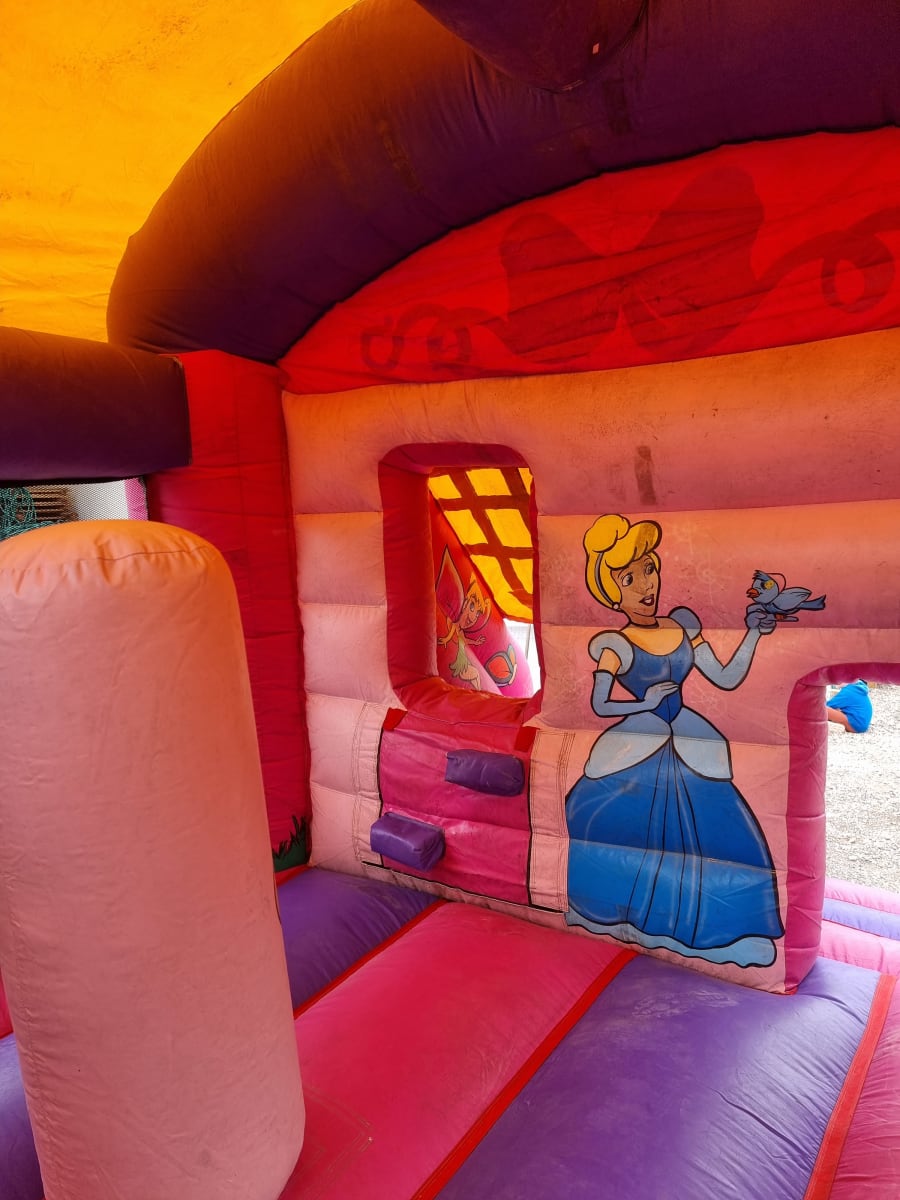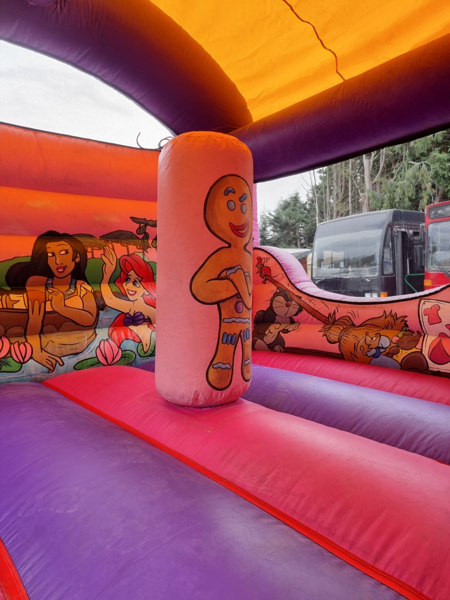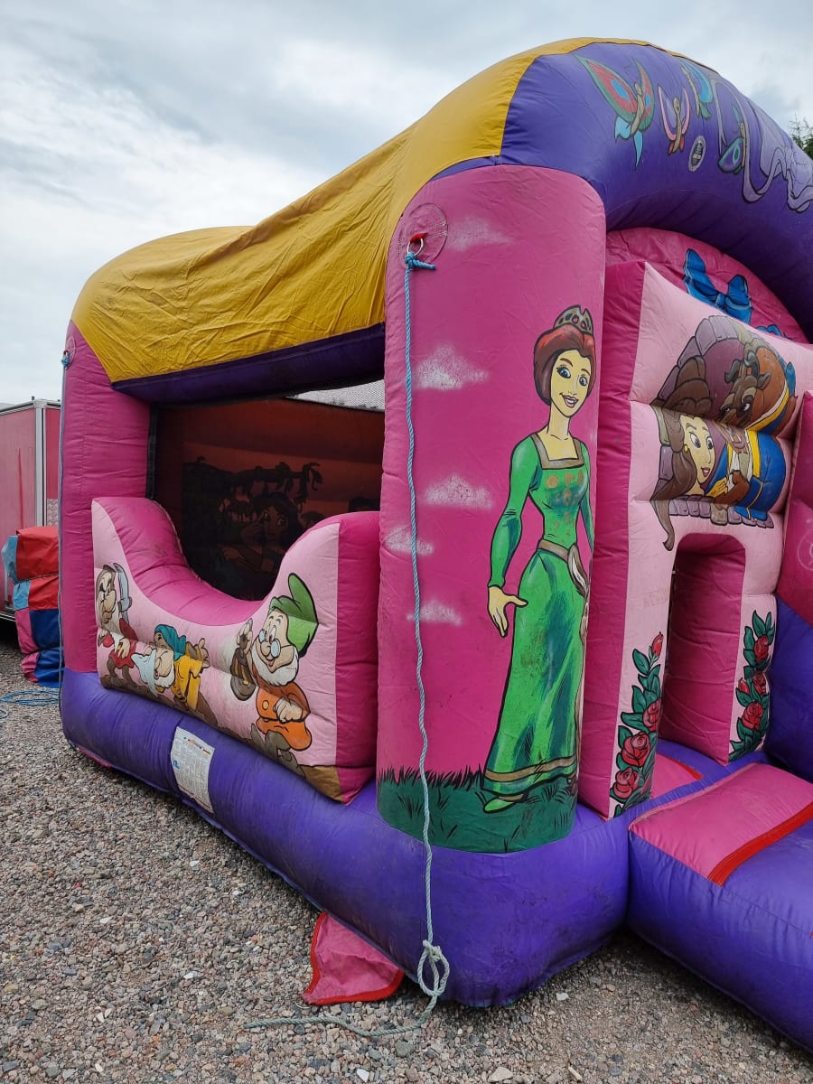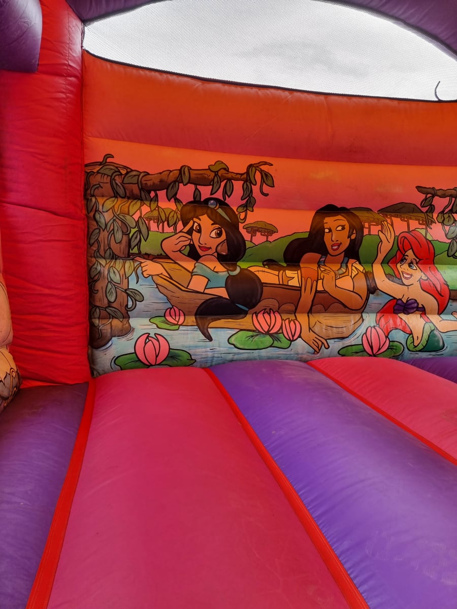 This beautiful Enchanted Princess bounce and slide is home to the most iconic fairy tale characters we all know and love. On the front frame you will see princess Fiona with the hilarious donkey sat proud at her side! You will also notice the amazing princess snow white, holding her dress in the classic princess manor. To the side of snow white is where the excitement happens! The great slide has a gate graphic design cover to keep the main part dry so the weather cannot ruin your day. Inside you will see jasmine and Pocahontas having a brilliant time with princess ariel as they relax on the gorgeous water backdrop. We also provide safety mats at all open areas of the bounce and slide, helping to ensure safe fun throughout the event!