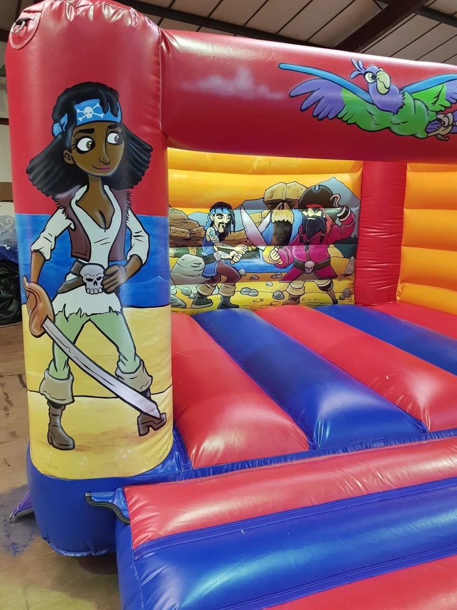 This stunning castle is a beautiful combination of bright and bold colours, such as red, yellow and blue! The unique colour patterns make this castle even more special, ready to create the party vibe you will be wanting on your special day! Covered in an array of exciting pirate themed artwork, you will be amazed by the amazing pirate atmosphere this castle can create! On the backdrop, you will find two brave pirates with their swords at the ready, ready to battle into the night hours. On the front of the frame, one very gorgeous and strong pirate stands proud on the left, while a dashing pirate occupies the right pillar. Wanting even more? There is also a glorious parrot flying high across the H frame of this pirate paradise. This will just what you’re looking for to bring the pirate feel to any event!