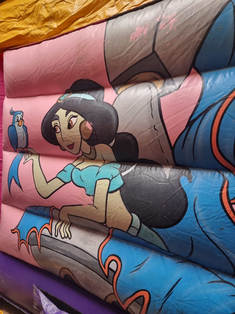 This beautiful fairy tale castle has gorgeous base colours of pink and purple! On the front frame of the castle, you will notice amazing graphic artwork portraying windows, adding to the typical fairy tale castle theme. Inside the windows you will see some familiar faces! The pretty princess Belle sits softly in her window, and on the other side lovely snow white is ready to welcome everyone to her castle. On the backdrop you will see princess jasmine talking to her dear friend as they enjoy the fairy tale scenery.