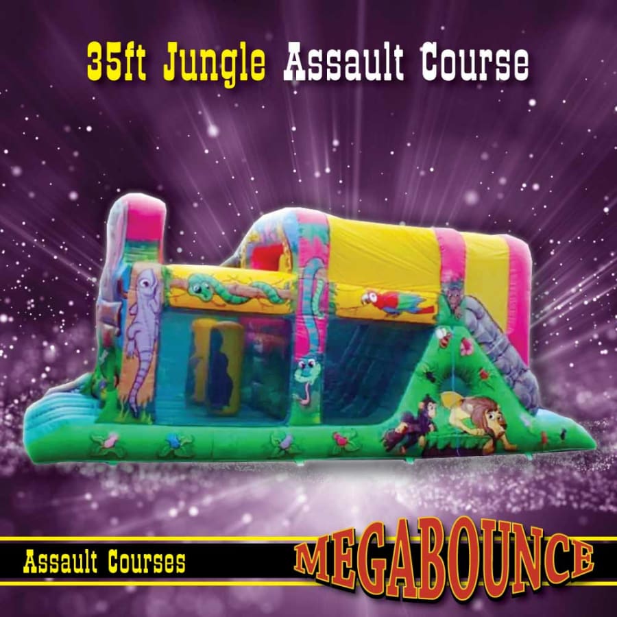 This brilliant 35ft jungle assault course shines in bright colours that will make this brilliant inflatable the centre of any party. With the base being different shades of green, it will help to create that great jungle feeling you’re trying to make. Covering the course, you will see an array of stunning graphic artwork that depicts all your favourite jungle animals. You will see the bold and brave lion, the reptiles crawling and climbing the walls and so many more jungle friends! Bound into the opening of the assault course and be ready to face the bish bash on your way through. Jump on them, bounce around them or knock them down, whatever you want! Leap through the tunnel to reach the climbing wall! Finish the course with the exciting slide and get ready to go again! It is the perfect option for any event where the kids want a little competition and enjoy some tests of strength!