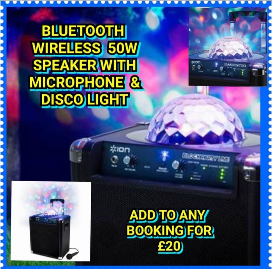 Great for any party with built in light and microphone for karaoke or to get the attention of the kids without shouting. You supply a Bluetooth device ie phone iPad ect with the music on which links to the speaker which is 50watts so nice and loud if you want it to be. Another great part of the speaker is when it is fully charged you can use it wireless for up o an hour.