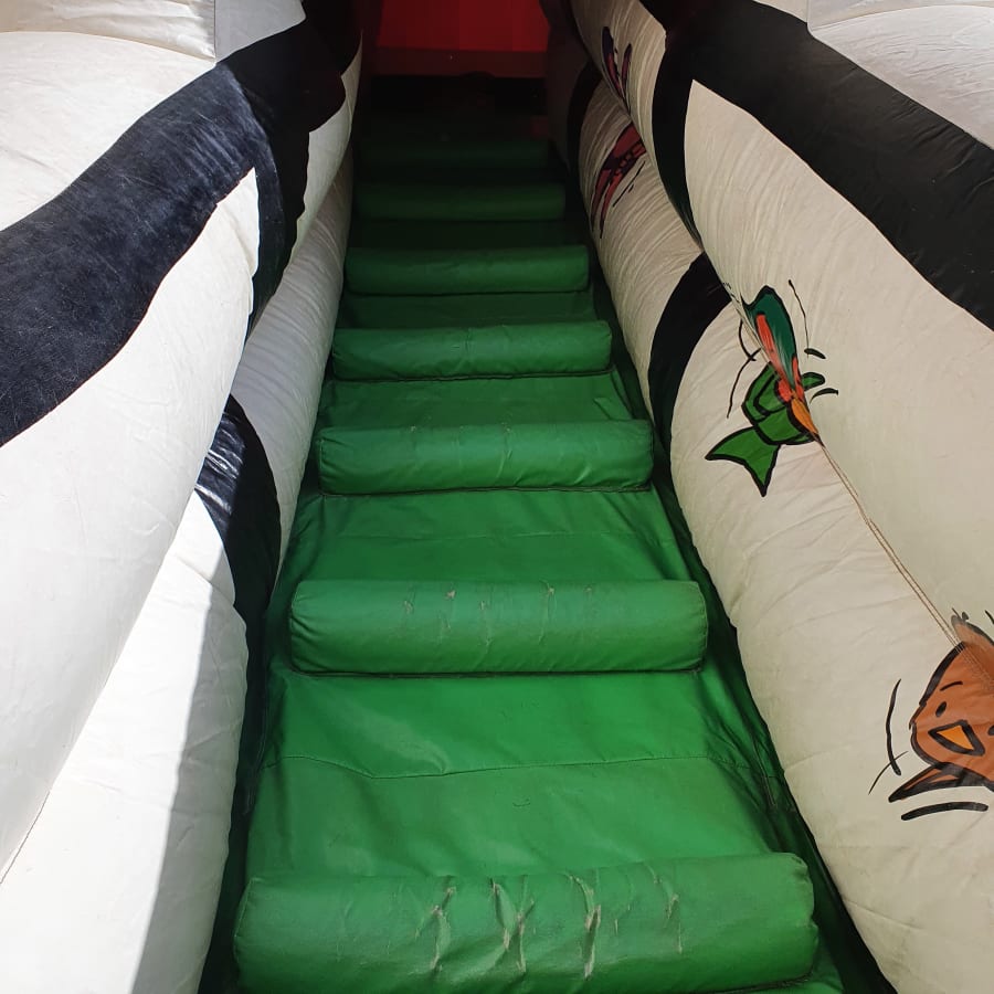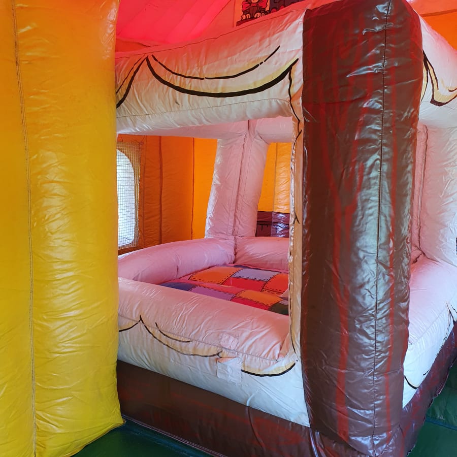 The first thing you will notice is the sheer size of this stunning inflatable crazy cottage. It is full of exciting and unique features, which will keep all the children busy and playing all day. With two bouncing areas, there is room for everyone to bounce safely and enjoy more time on the inflatable. Face bish bash as you travel throughout the cottage, knock them down, jump on them, weave through them! The options are endless and are a real treat to the kids imagination! Climb the walls to reach the two amazing slides! Adventures into all the unique play areas, each themed to suit a room of the crazy cottage! All the brilliant graphic artwork helps to set the scene of the crazy cottage and makes this inflatable an apple to anyone’s eye. To help ensure safe fun, we do provide safety mats at all open areas of the fun run, so you don’t have to worry!