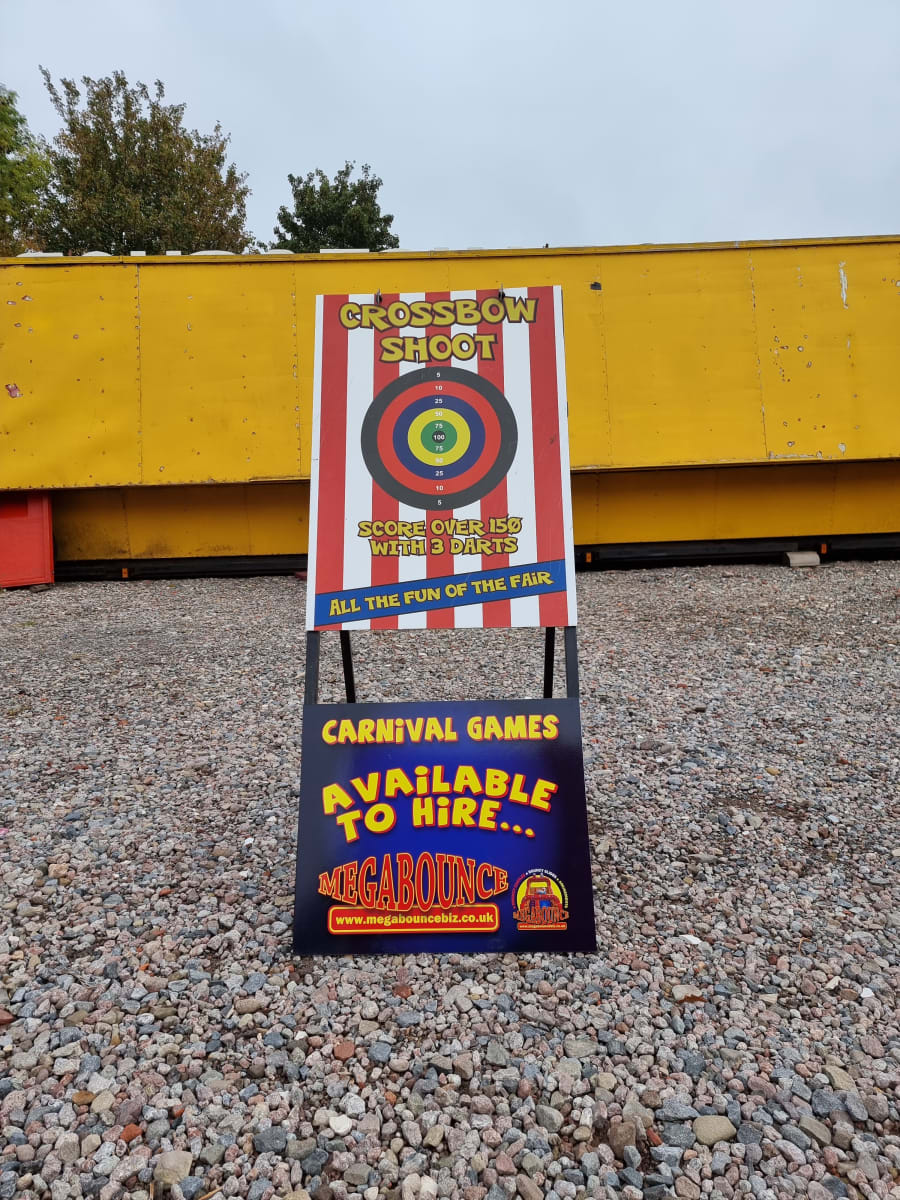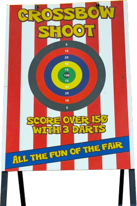 Crossbow target is a brightly coloured eye-catching side stall which is sure to grab everyone’s attention. Although fun, it is also very challenging! It can be difficult to win, so make sure your guests bring their A game! The objective of this game is to move the Crossbow in the direction you want to aim. Place your dart in the Crossbow. It’s a challenge for your aim persistence and strength control.