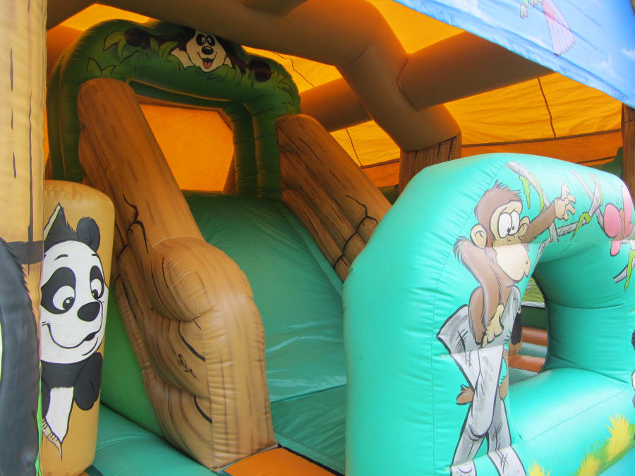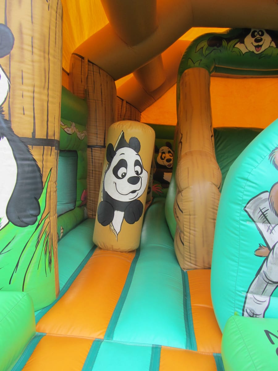 This beautiful castle is a bundle of surprise, full of unique features and exciting twist, it will be just what you need to keep everyone on their toes. On the outside of the castle, you will first notice two slopes, providing safe and secure entry and exit to the castle. On the front pillars, there are stunning hand painted panda’s ready to welcome you into their joyful home! The bright blue cover at the top of the frame will add the pop of colour to your day, drawing all the best kinds of attention! Taking a trip inside the panda adventure, there are Bish Bash men, which provide fun for all the family as you knock them down and jump on them! Wanting even more? We’ve got you covered! Something very special is within this castle, a slide! The mini slide located at the back centre of this bouncy castle will be the talk of the party and make your day memorable for years to come. The sewn in shower cover ensures protection should the typically British weather try to rain on your parade.
